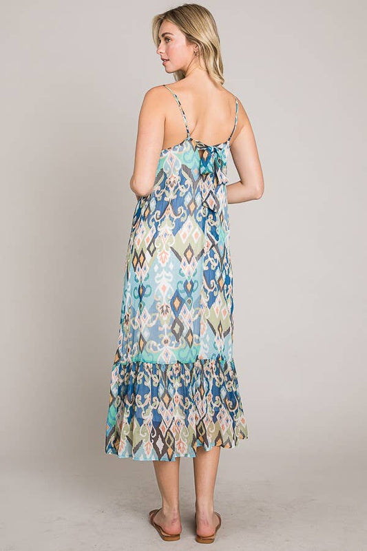 Sleeveless Ruffle Hem Tie Back Printed Woven Maxi Dress